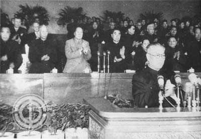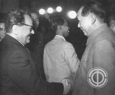 毛主席会见应邀参加工会八大的外国工会代表团,与法国总工会代表握手。