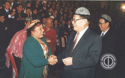中国工会第十三次全国代表大会上,江泽民等国家领导人与代表亲切握手。