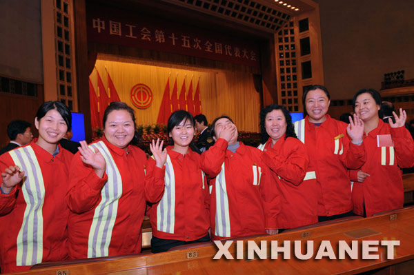 2008年10月21日,中国工会第十五次全国代表大会圆满完成了各项议程,在北京人民大会堂闭幕。这是应邀旁听大会的北京市东城区环卫工会会员在会场合影留念。新华社记者何俊昌摄