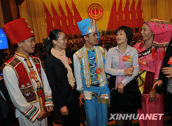 2008年10月21日,中国工会第十五次全国代表大会圆满完成了各项议程,在北京人民大会堂闭幕。这是中共中央政治局委员、全国人大常委会副委员长、中华全国总工会主席王兆国会后与代表们交流。 新华社记者何俊昌摄