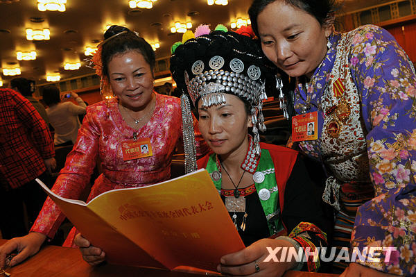2008年10月19日,来自云南的工会代表罗萍(中)和同伴一起阅读中国工会第十五次全国代表大会会议文件。近年来,中国各级工会坚持把女职工组织建设和发展女工会会员作为重要工作来抓,特别是让女职工加入到工会组织中来,使她们的权益得到更好保障。截至2008年6月,在全国工会会员中,女性会员达7243.7万人,占34.7%,比2003年增加了2642.5万人,增长了57.4%。新华社记者 何俊昌摄