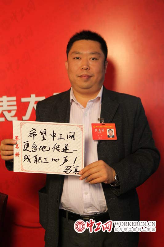 10月18日,中国工会第十六次全国代表大会在北京人民大会堂召开。为做好报道工作,中工网在京西宾馆大会新闻中心临时搭建演播室,为来自全国各地的一线基层代表进行一对一的访谈。图为黑龙江齐齐哈尔齐二机床集团马恒昌小组组长,中国工会十六大代表马兵为此次大会及中工网写下的祝福。
