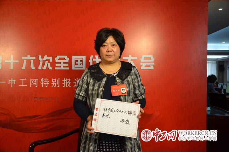 10月18日,中国工会第十六次全国代表大会在北京人民大会堂召开。为做好报道工作,中工网在京西宾馆大会新闻中心临时搭建演播室,为来自全国各地的一线基层代表进行一对一的访谈。图为全国劳模、江西海扬纺织集团工会副主席、中国工会十六大代表马玉霞为此次大会及中工网写下的祝福。