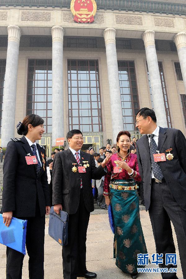 10月18日,中国工会第十六次全国代表大会在北京人民大会堂开幕。这是大会结束后,几名与会代表在相互问候、交流。 新华社记者何俊昌摄
