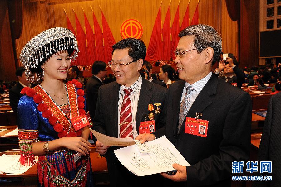 10月18日,中国工会第十六次全国代表大会在北京人民大会堂开幕。这是三名与会代表在会议间隙交流。 新华社记者何俊昌摄