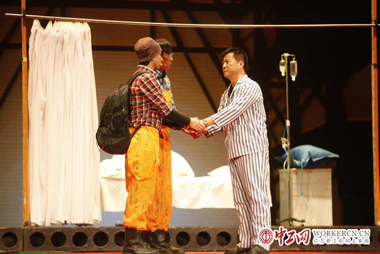 此刻,第七届全国话剧展演优秀剧目《格桑花》感动了中国工会第十六次代表大会的全国代表们:2001年,举世瞩目的青藏铁路建设者们,在海拔5010米高度的大风山隧道工地工作。罕见的冻土、紧迫的工期、恶劣的施工环境都不算,还要加上让人窒息的缺氧——然而,所有的困难都阻挡不了建设者们的坚持和决心。当大风山隧道终于全线贯通、当全部一线工人以“高原病零死亡率”圆满完成任务,终于创造出世界铁路建设史上的奇迹。
