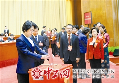 10月20日,一位代表在投选票。当日,中国工会第十六次全国代表大会第二次全体会议在北京人民大会堂举行,选举产生中华全国总工会第十六届执行委员会和经费审查委员会。 新华社记者 何俊昌 摄