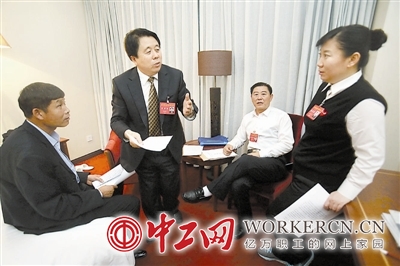 10月20日,在辽宁代表团驻地,范文学、孙恩波、高绍华、梁玲(图左至右)4位代表聚在一起交流经验、相互取经。虽然岗位不同,但4位代表都认为,劳动关系和谐是社会和谐的基础,只有齐心协力、同心同德,才能实现中华民族伟大复兴的中国梦。中工网记者 杨登峰 摄