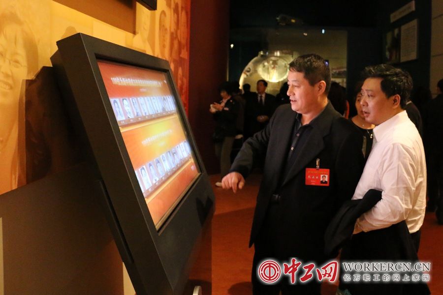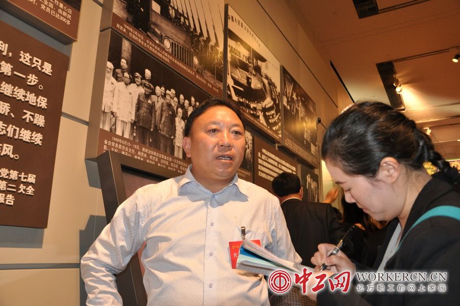 图为参观展览的工会十六大代表接受中工网记者采访。中工网记者 姜防震