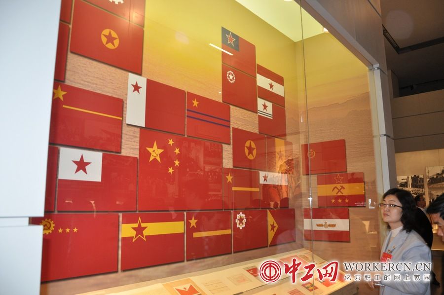 图为第一届中国人民政治协商会议上部分国旗设计方案的展示吸引了一位代表。中工网记者 姜防震 摄