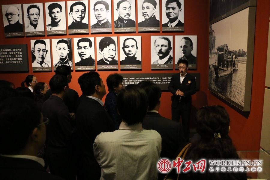 中国共产党一大的资料展区旁,参观展览的代表正在认真的聆听讲解员讲解中国共产党诞生的历程。中工网记者 郑一强 摄
