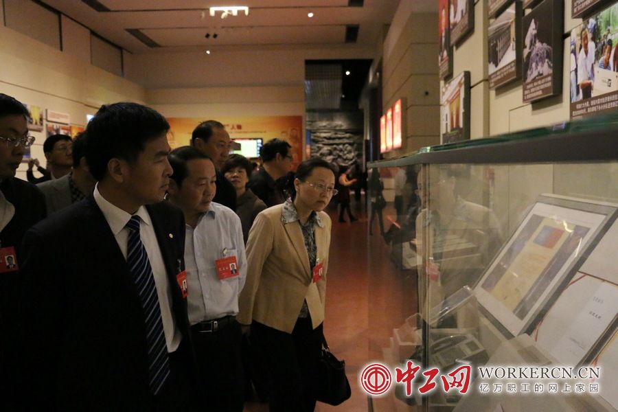 图为参观展览的工会十六大代表仔细观看展品资料。中工网记者 姜防震 摄