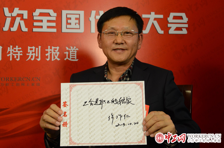 10月18日,中国工会第十六次全国代表大会在北京人民大会堂召开。为做好报道工作,中工网在京西宾馆大会新闻中心临时搭建演播室,为来自全国各地的一线基层代表进行一对一的访谈。图为中国工会十六大代表、吉林省白山市总工会主席仵作仁为此次大会及中工网写下的祝福。 (中工网记者 笑语摄)