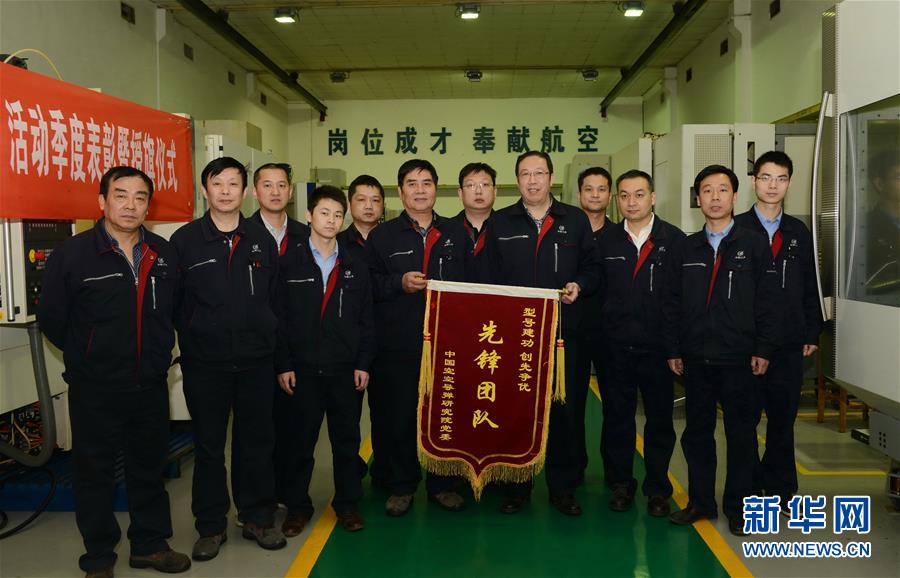 在位于河南洛阳的中航工业空空导弹研究院十一分厂,鲁宏勋(右五)带领的班组获得导弹院“型号建功先锋团队”锦旗(2013年4月18日摄)。新华社发