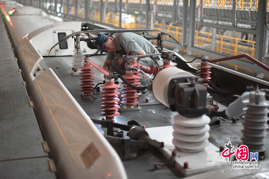刘波登上车顶检修动车。 中国网记者 张若梦 摄