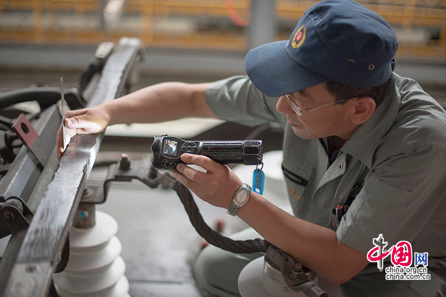 刘波正用录像手电和卡尺对动车受电弓进行检查。 中国网记者 张若梦 摄