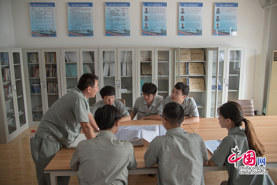 刘波在“刘波劳模创新工作室”中和年轻同事交流分享。 中国网记者 张若梦 摄