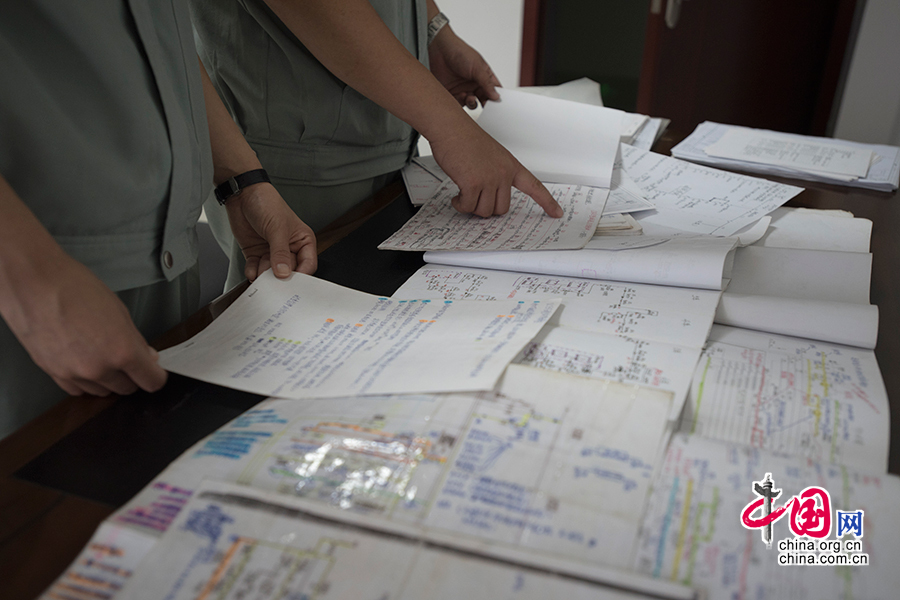 年轻同事向刘波请教问题,刘波查阅自己的学习笔记。一些眼看有被破损倾向的手稿被刘波用透明胶条粘了个遍。 中国网记者 张若梦 摄