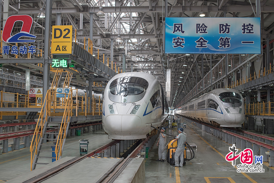 中国网青岛讯(记者 张若梦)完成了一次运输旅客的任务后,动车组要去哪里?在济南铁路局青岛动车段,动车们要去找机械师刘波和他的同事们“报到”。经过他们的精心检修和保养,动车组才会以崭新的面貌再次出发。