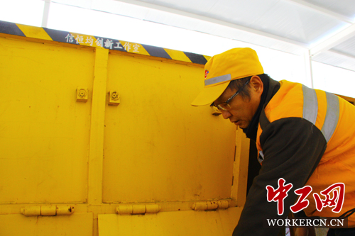 多年来,路基换填施工一直沿袭传统换填方式,使用柳条筐搬运、倾倒石砟。沉重的石砟筐不论是搬运还是倾倒都费时费力,让工人苦不堪言。今年春季“集中修”过程中,相对于挖掘机代替人工挖砟的新工艺,人工搬运石砟就显得格外落伍。在现场盯控的副段长刘涛、张启云与信恒均探讨“小车推道砟”的思路,说着说着,信恒均脑中灵光一现,当即从工地回到修理间。五天之后,一台从未见过的卸砟专用车出现在大家面前,所有人都充满好奇。4个车轮、5块地铁板组成的微型敞口货车箱体,前后左右4个侧下部均可打开的简单结构却成了减少作业工时的神器。经过三次改进,卸砟车每次可装满相当于500筐的石砟。挖掘机装车4分钟、推送到卸砟地点4分钟、卸车4分钟,10分钟就可以完成从前一个多小时的工作量,职工们称之为“卸砟神器”。