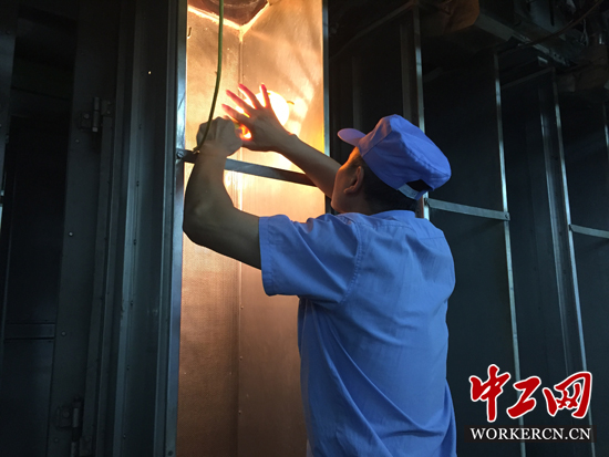 张国华查看喷丝板漏胶情况。中工网记者 刘英杰 摄