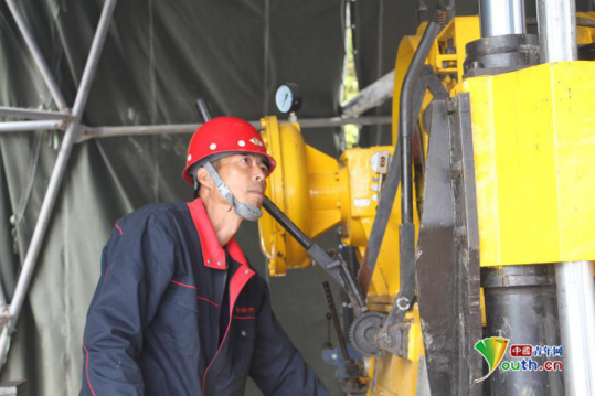 郭广波在钻探工作台旁观测仪表数据。中国青年网记者 刘利影摄