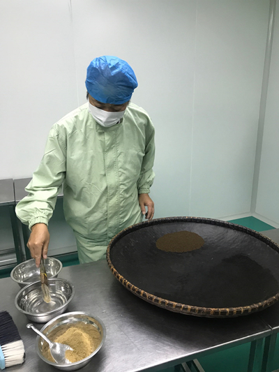据介绍,微丸的粒重约3-18mg左右,而六神丸更是达到了微丸的极致,每丸仅重3.125毫克,直径仅为0.8毫米,要在一粒仅为3毫克多的丸药中,包裹进处方所规定的各种药材,形成药丸小,质地紧密,圆整均匀,色泽一致,丸重稳定。同时服用后,药物有效成分能快速、持久地释放,达到疗效的要求,这都需要在手工泛丸过程中凭借操作手法、力度、频率以及经验才能做到,且质量、疗效都符合国家标准,堪比微雕艺术,是目前中药行业内的一般泛丸工做不到的。