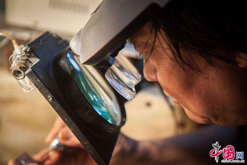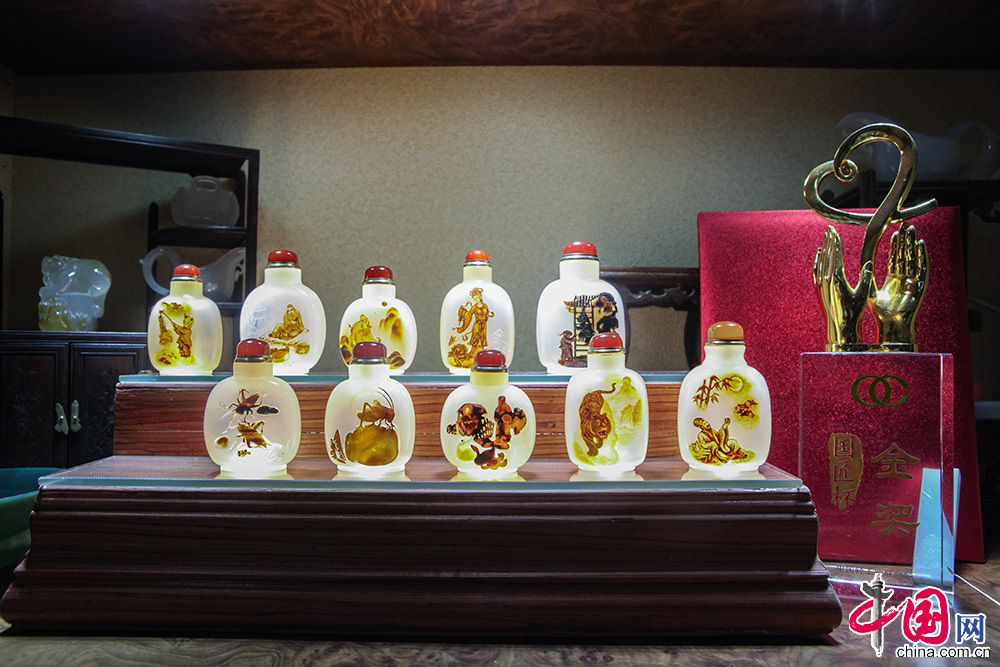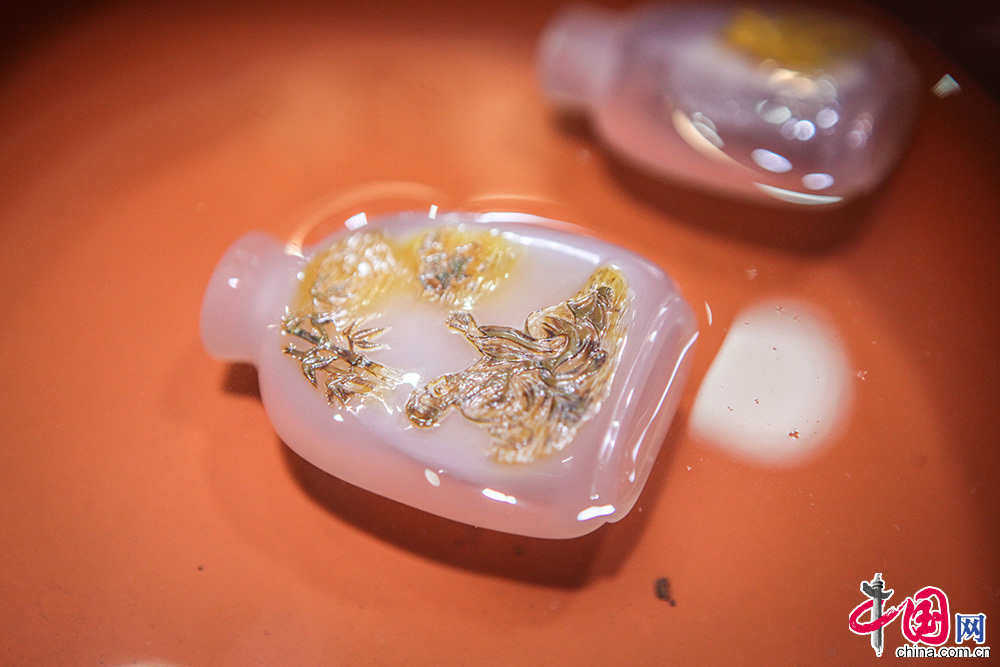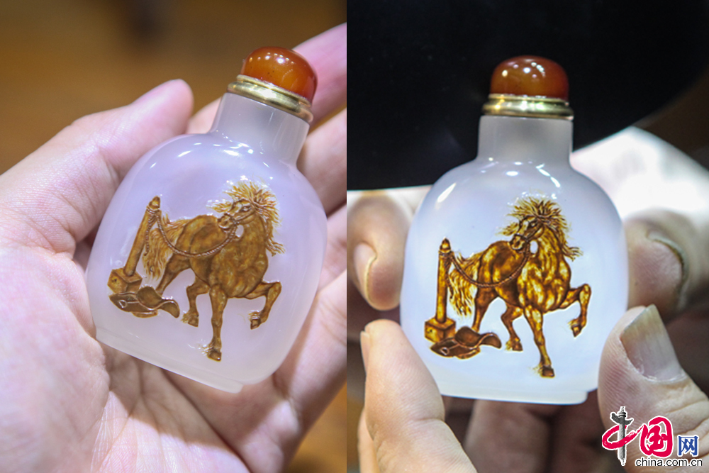 除了内容创新,李克生也在技艺上不断创新。鼻烟壶的图案在灯光下变得栩栩如生,富有立体感。中国网记者伦晓璇摄