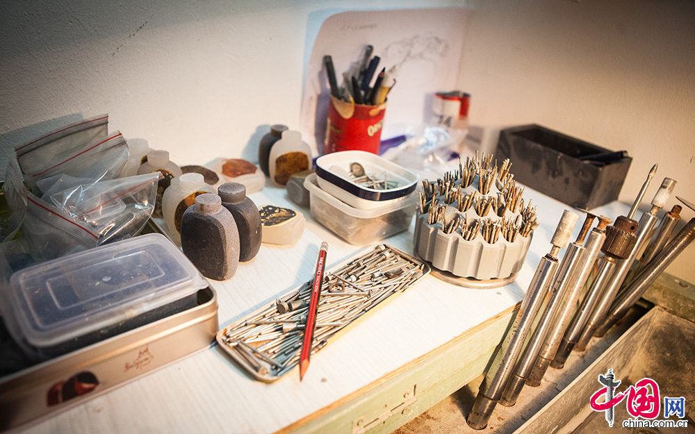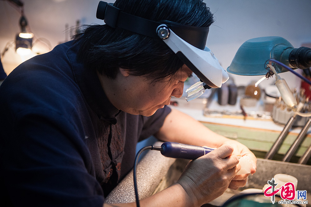 根据徒弟们的功底和性格,李克生会因材施教,发掘每个人的特长。但不管资质如何,李克生总要叮嘱徒弟们先把自己的素养和思想修行好,“雕玉先雕心”。工作室的墙上挂着徒弟们的绘画习作。晚饭后,李克生经常指导徒弟们进行绘画练习。中国网记者 伦晓璇 摄