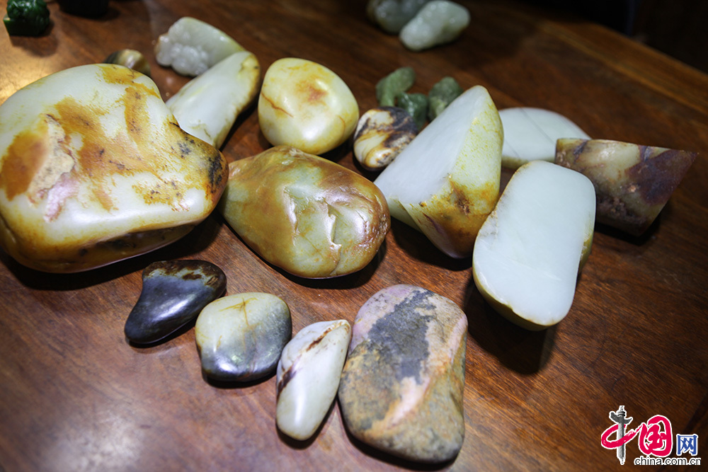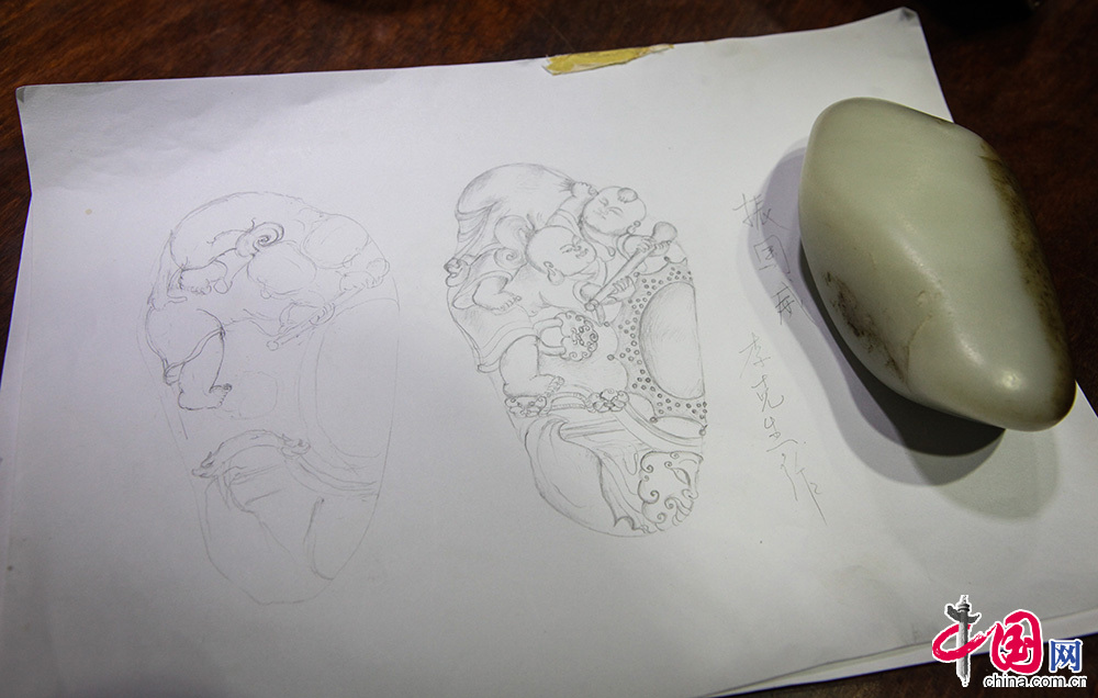 在看到一块玉石材料时,想要制作什么作品,李克生心中便有了大致的想法。要根据每块玉石的质地和纹理,设计不同的图案。受父亲影响,李克生对潮州大锣鼓有着特殊的情感,在潮州地区敲锣打鼓也寓意着吉祥,因此他根据这块和田玉籽料的形状设计出以振国威、振家声为主题,孩童敲锣打鼓的图案。中国网记者 伦晓璇 摄