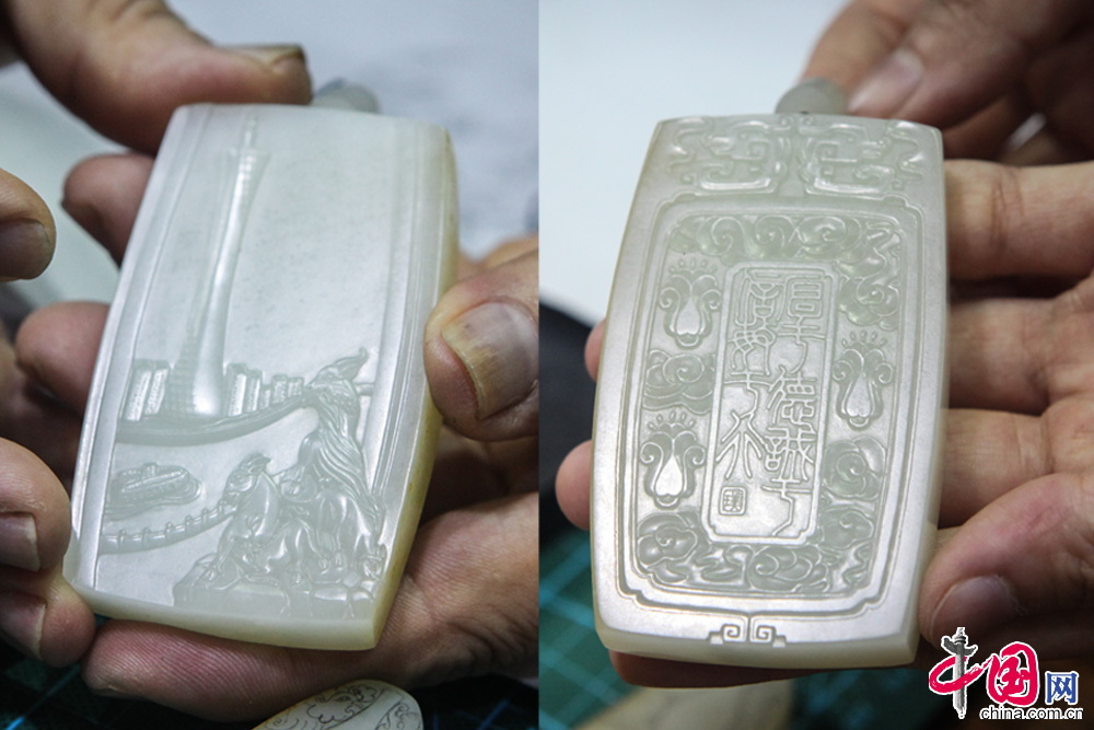 李克生在传承传统鼻烟壶制作的同时,与时俱进创作了很多传统与现代结合的作品。在这块名为《羊城•印象》的玉牌上,珠江分隔两岸,一侧是象征羊城历史文化的五羊雕像,一侧是象征广州蓬勃发展新貌的广州塔,作品背面则在玉雕中传统的“子冈牌”上巧妙雕刻广州市花——木棉花。中国网记者 伦晓璇 摄