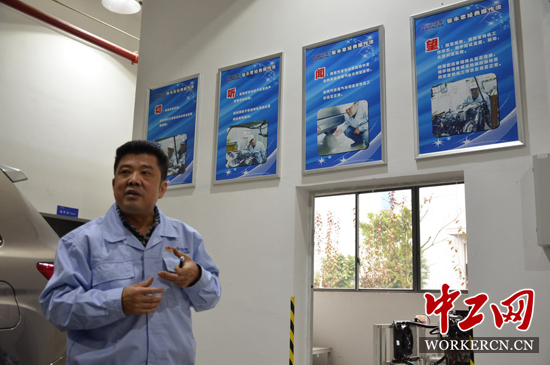 张永忠向记者介绍自己总结的“望、闻、听、切”的发动机维修工法。