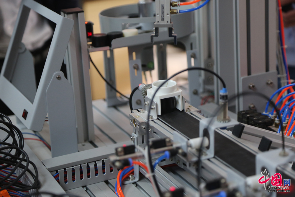 学员用来练习的光机电一体化实验装置,这是一个模拟机械手臂编程自动识别分拣系统,如果一个学员可以独立完成模拟机械手臂的编程,基本就达到了技师水平。(中国网 杨楠 摄影报道)