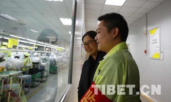 图为吴福全(前)简要介绍手机生产流程。摄影:杨月云