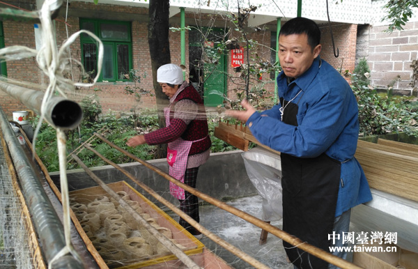 李俭康在为苎麻纤维上浆。(中国台湾网 王文英摄)