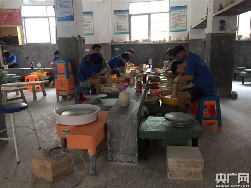 工作室有两千多平,在景德镇工坊中属于中等规模,每层功能分明,一层用于学生学习拉坯;二三层用于修坯及陈列,四层展示的是占绍林及学生的作品,五层则用于亲子体验。