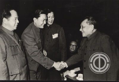 中国工会第十次代表大会上,邓小平和新当选的全总领导人倪志福、尉健行、罗干亲切交谈。