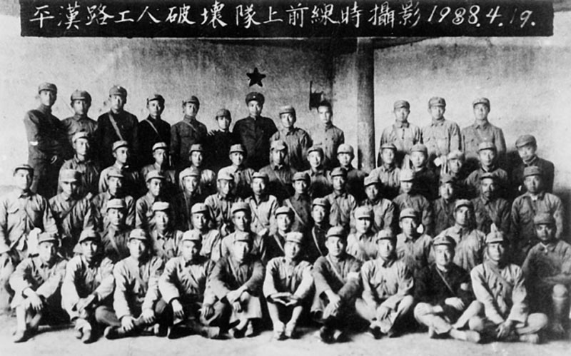 1938年4月,平汉铁路工人开赴前线时摄影留念。