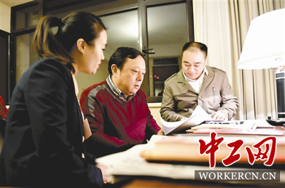 10月21日晚,四川代表团的李彦静、常荣、周茂华(从左至右)3位代表围坐在台灯下讨论第2天关于城镇困难职工精准脱贫解困的小组发言。工人日报—中工网记者 许之丰 摄