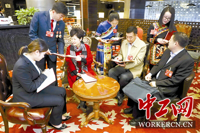 10月21日,北京铁道大厦,江西代表团的4位新代表邀请3位老代表利用会前时间讨论发言稿,他们大都来自基层一线。工人日报—中工网记者 王伟伟 摄