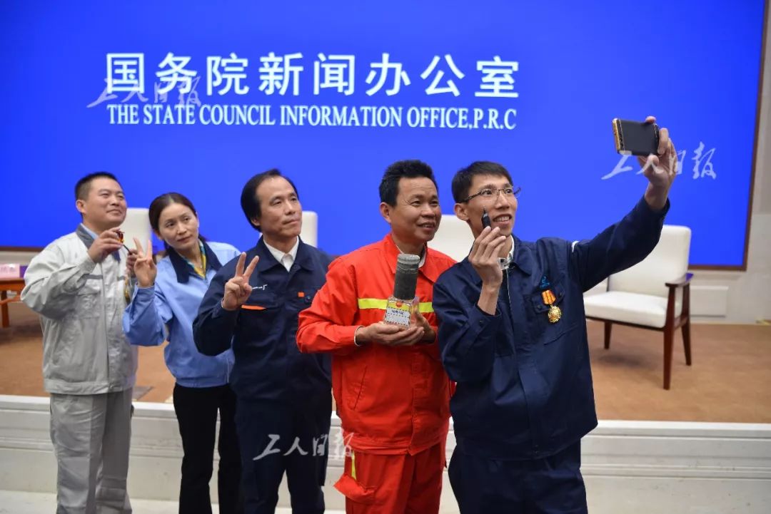 10月15日,国务院新闻办公室举行中外记者见面会,请5位产业工人优秀代表围绕“做大国工匠,争当知识型、技能型、创新型劳动者”主题与中外记者见面交流。见面会结束后5位产业工人优秀代表拿起手机自拍留影。