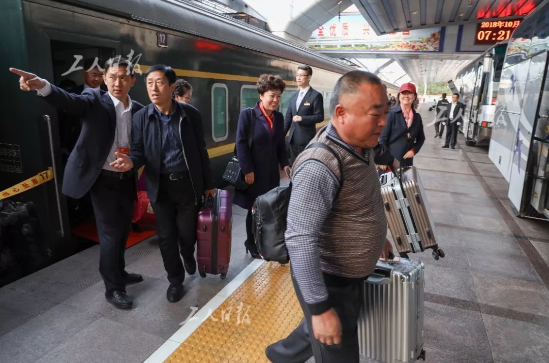 10月20日早上7时21分,出席工会十七大的黑龙江代表团抵达北京站。