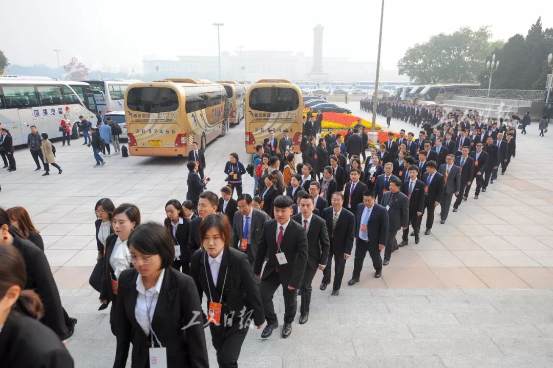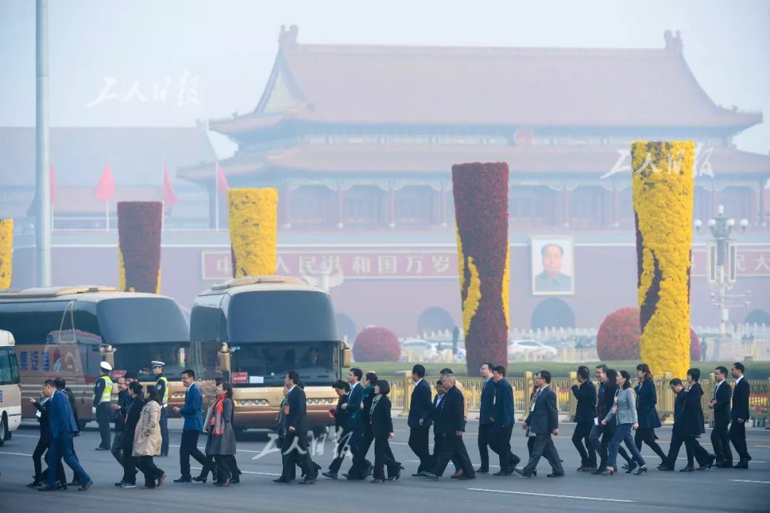 ↑10月22日上午8时,工会十七大的代表们穿过天安门广场,列队步入人民大会堂。
