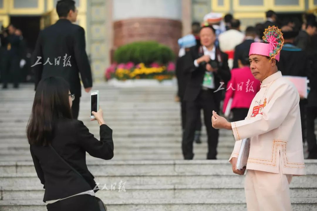 开幕式前,一位代表在人民大会堂前拍照留念。