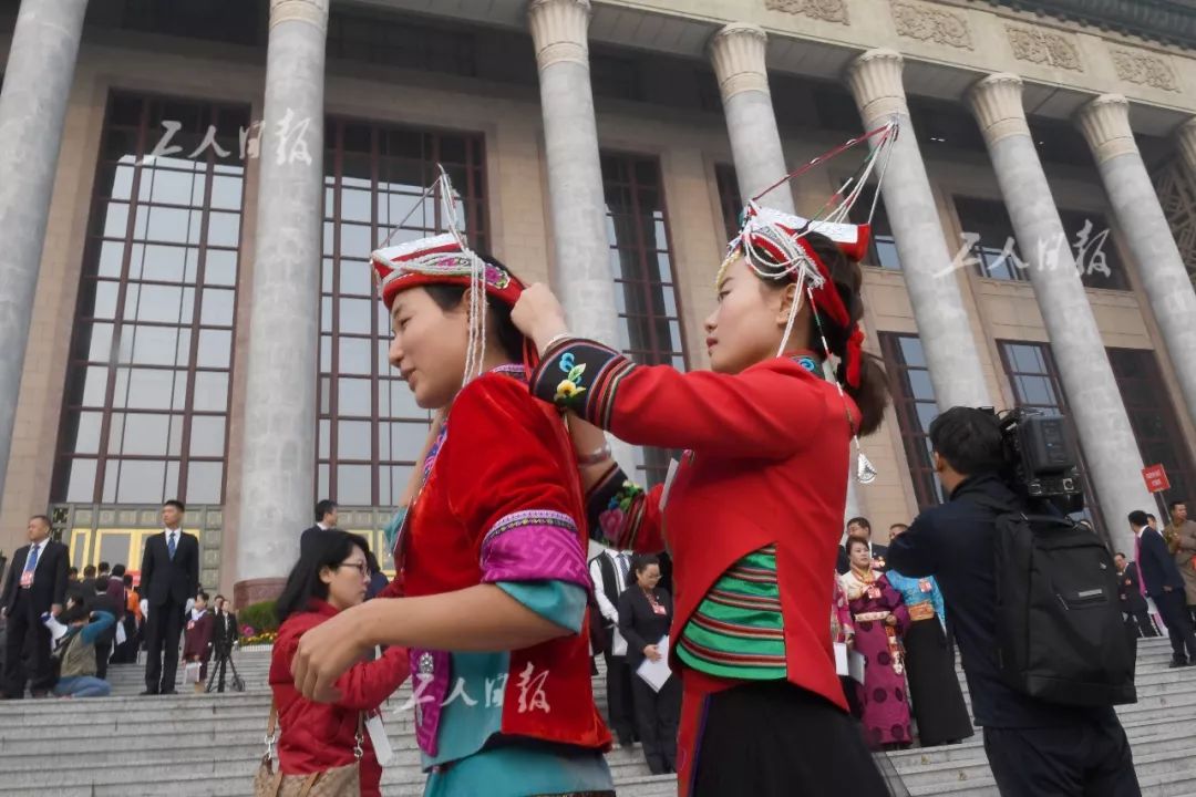 开幕式前,一位代表在为同伴整理头饰。