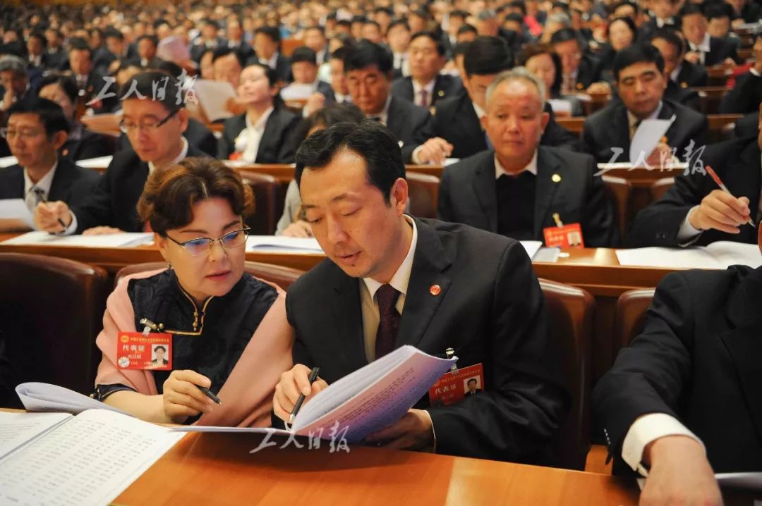 工会十七大开幕式现场,两名代表正在讨论会议报告。