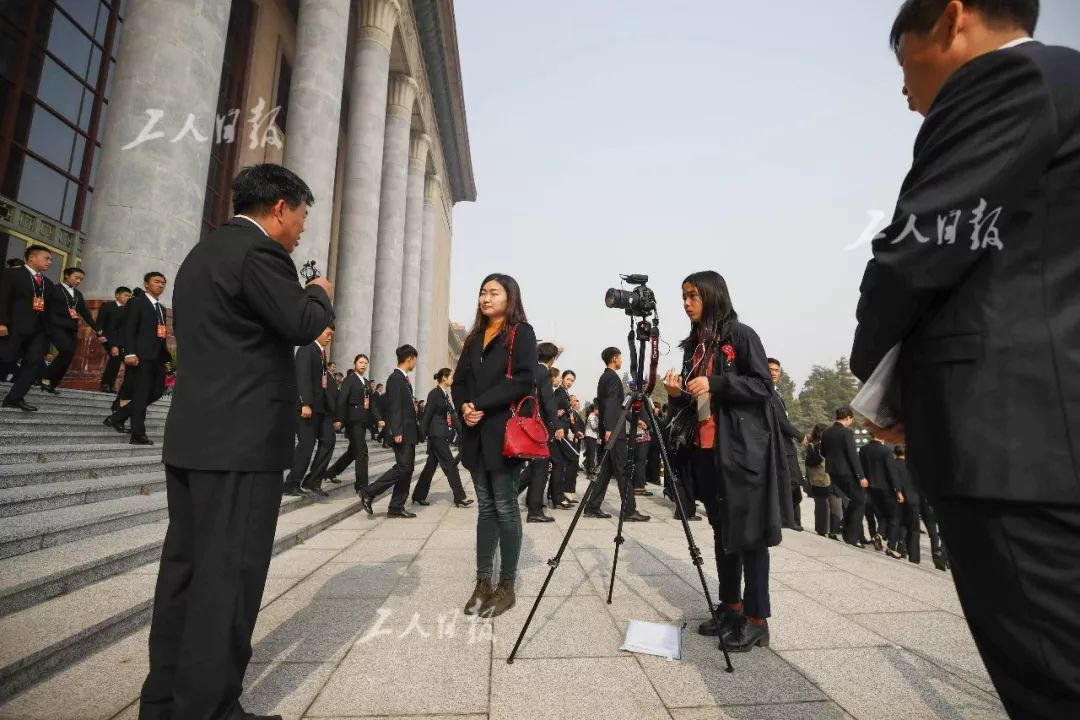 代表参加完开幕式后在人民大会堂门口接受采访。