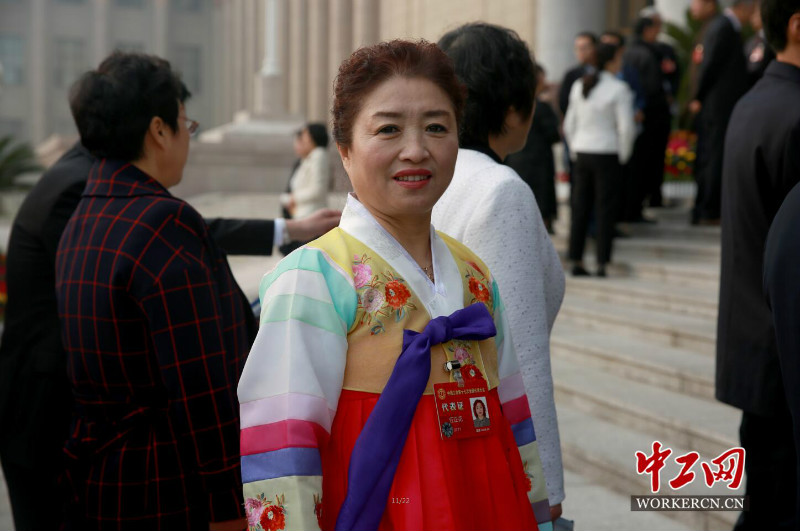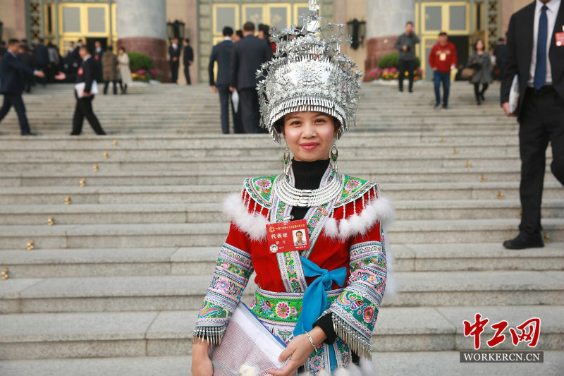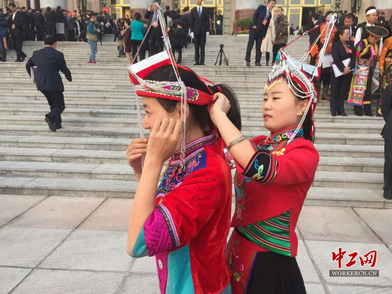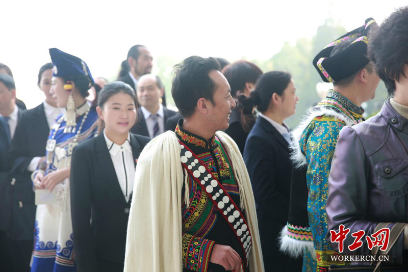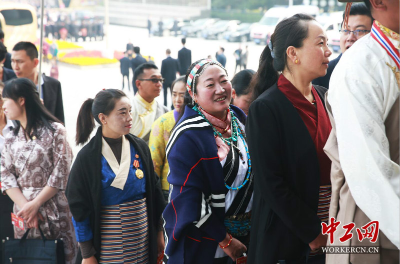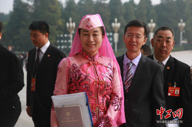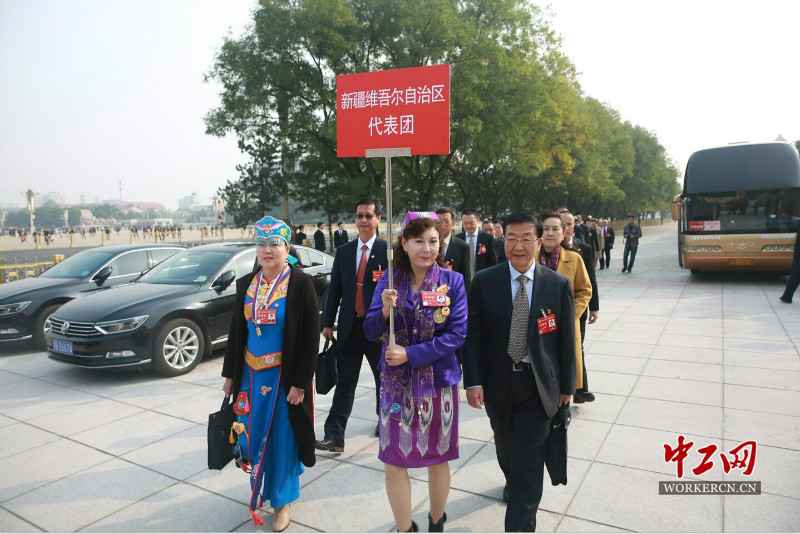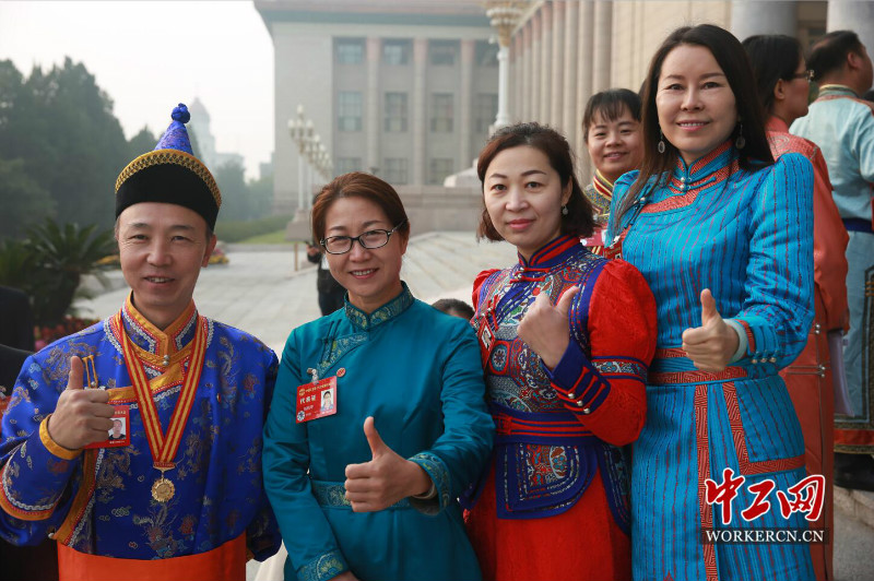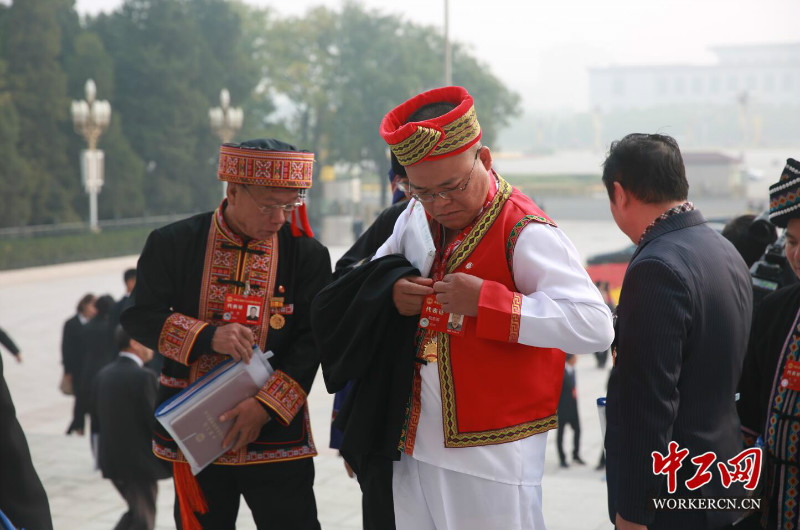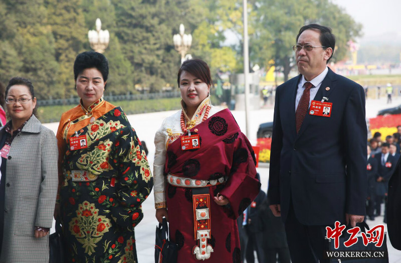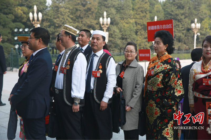 2018年10月22日,北京,中国工会第十七次全国代表大会于上午开幕。人民大会堂外,少数民族代表盛装入场。摄影:杨泽