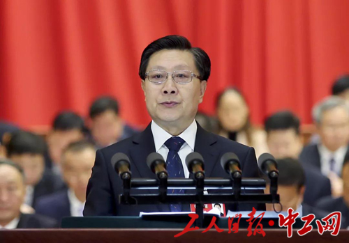 王东明代表中华全国总工会第十六届执行委员会作报告。工人日报--中工网记者 杨登峰摄