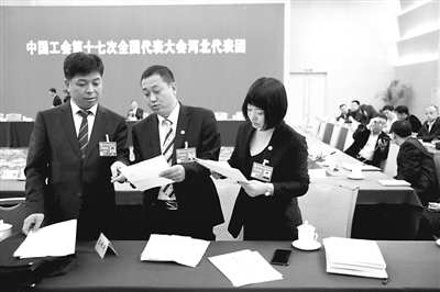 10月22日,在中国工会十七大分组讨论结束后,河北代表团的王银明(左)、范秀川(中)、崔利敏三位来自不同岗位的代表,就中国工会十七大报告,结合自身工作经历进行了交流。工人日报—中工网记者 王伟伟 摄